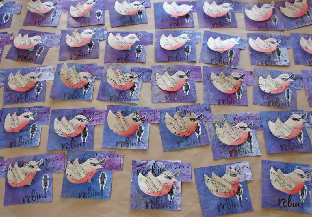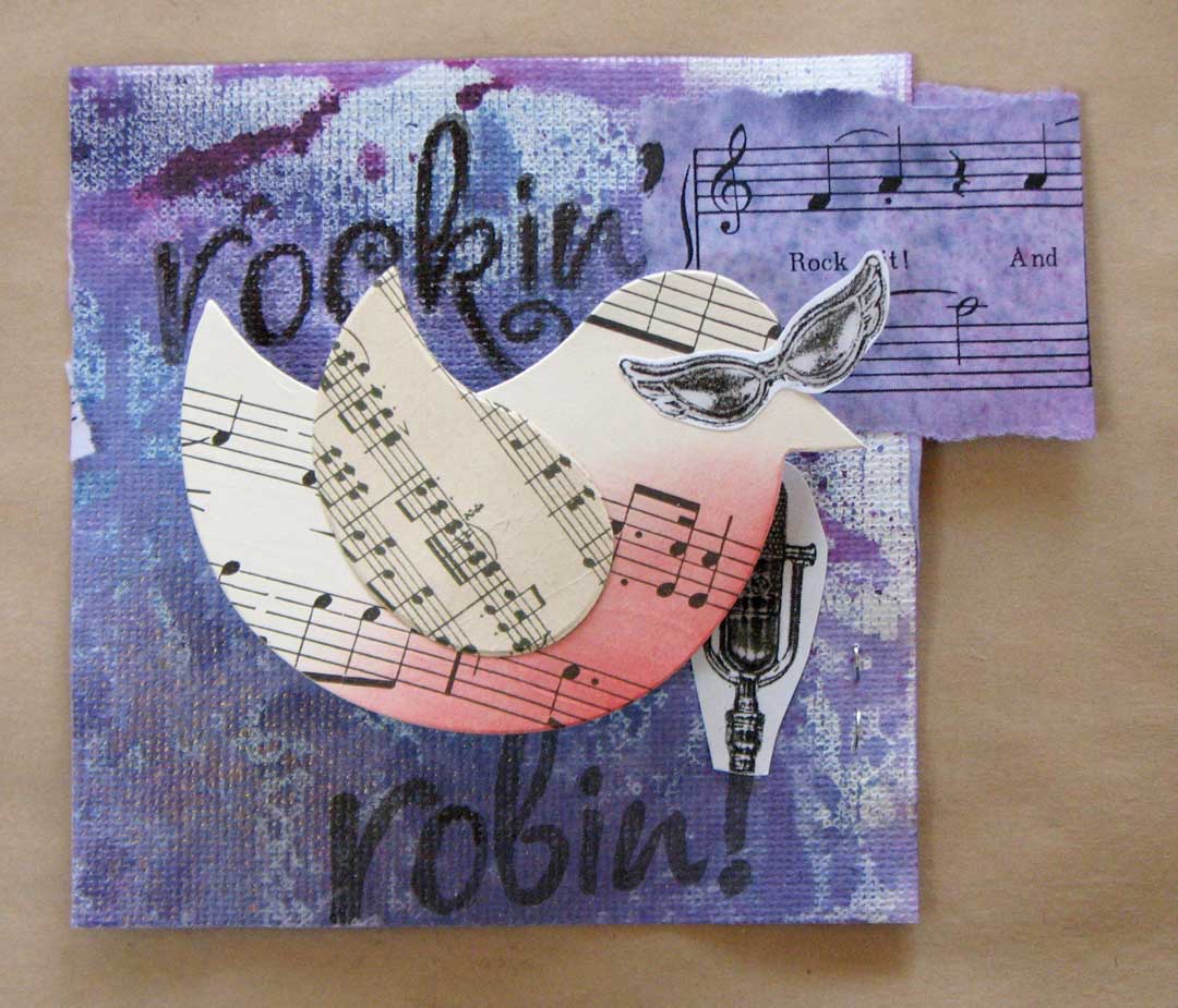 So, I finished my Fat Book pages for Art and Soul. The theme this year is "Rock 'n' Roll at Art 'n' Soul" so I did "Rockin' Robin". I used Ranger Inks to spray large pieces of canvas paper. I carved the words and stamped them, die-cut the birds from old sheet music and rubbed their tummies with red PanPastel, photocopied two charms (sunglasses and microphone) and glued them down. The bird is mounted with an accordian hinge so he "rocks" a little. I made 45 pages. Whew-eee!