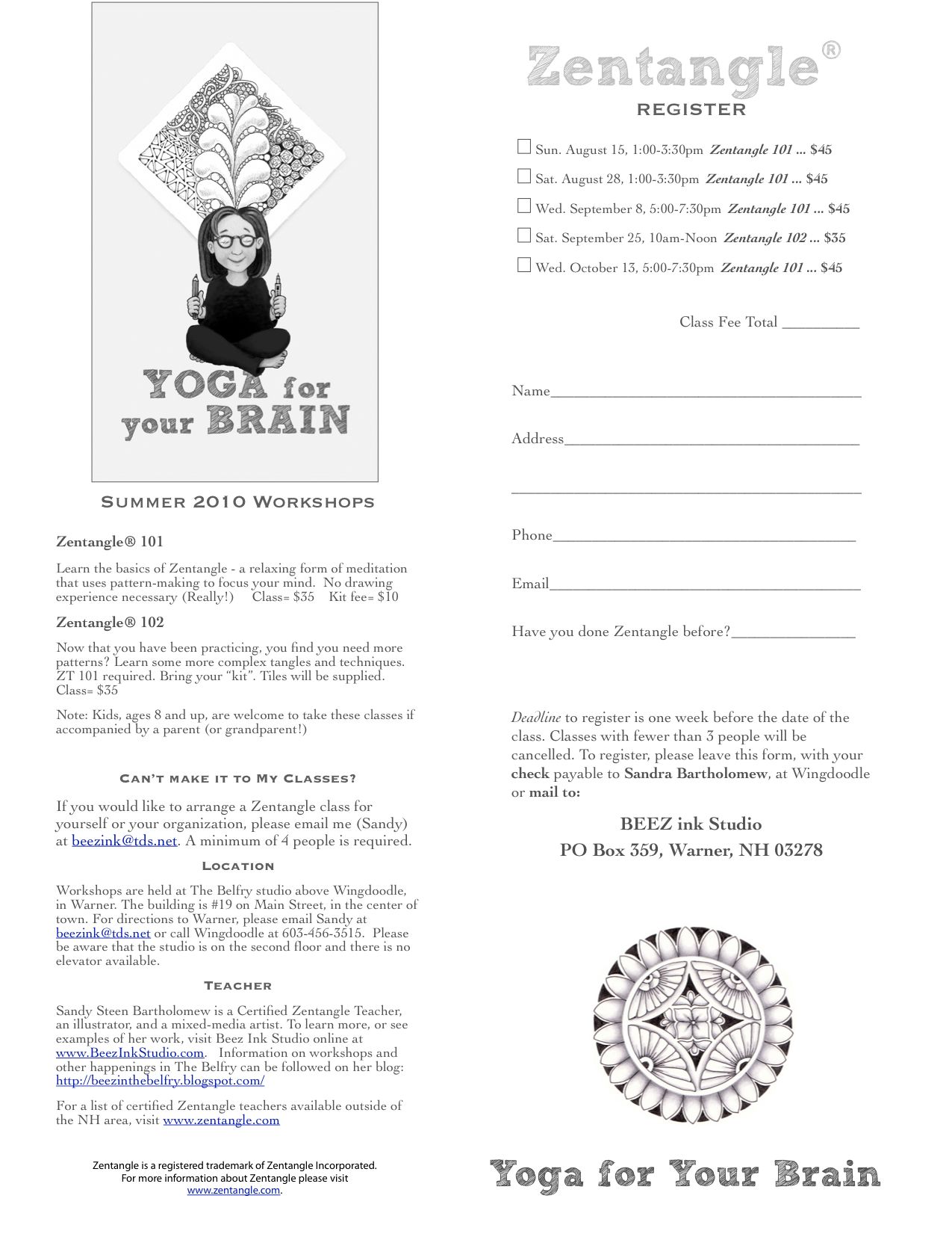 As you can see, I do not have a ton of classes listed for this summer. Students have been contacting me to set up classes on days that suit them and that works really well for me too. So, I have a few listed here and I encourage anyone reading this who has not taken a Zentangle class with a REAL Certified Zentangle Teacher (CZT) to hunt one down and take their class! (Just click on the Instructors link at www.zentangle.com). Accept no imitations! (hee hee)